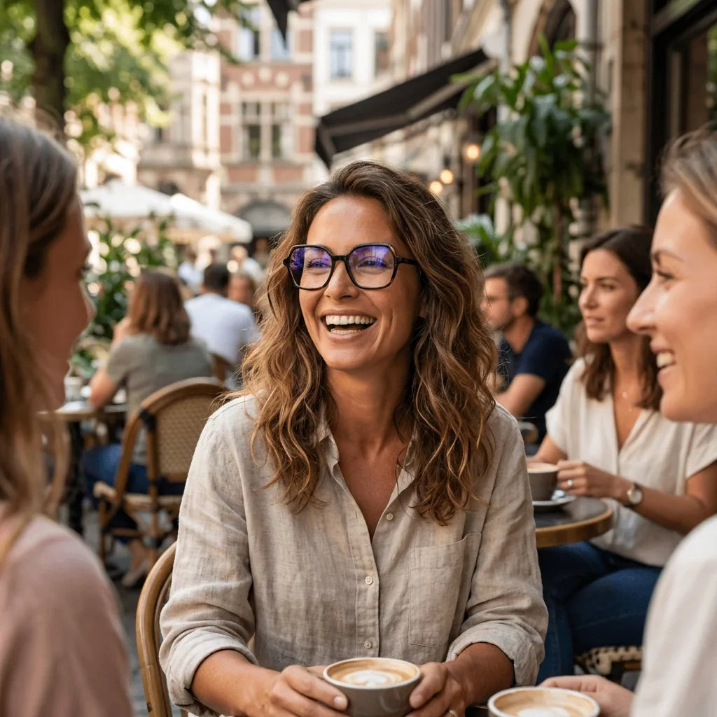 Lenses optical alba tortoise women in café with amigas ambiente social bonoboss