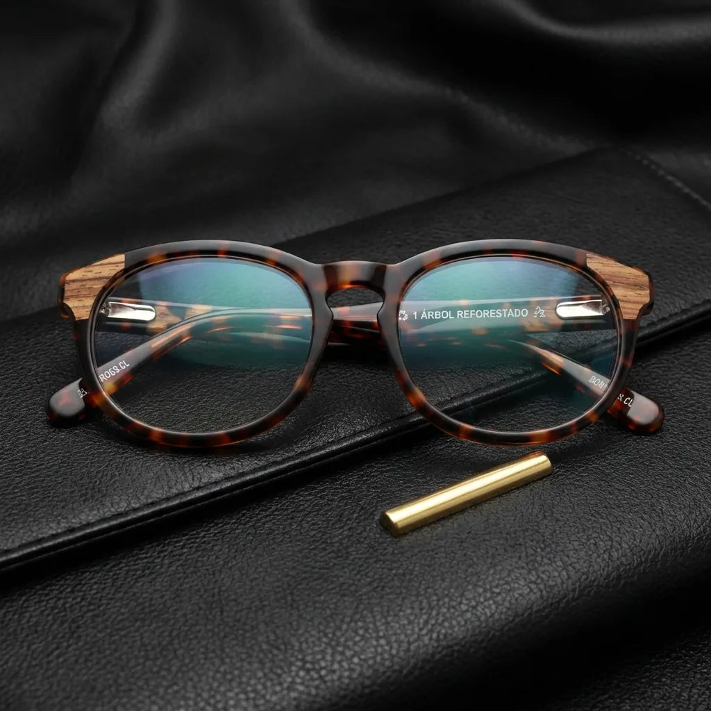 Optical frames frames sustainables round acetate with natural wood chiloe 0084 tortoise mayorista optica corporate gifts ecologicos Bonoboss