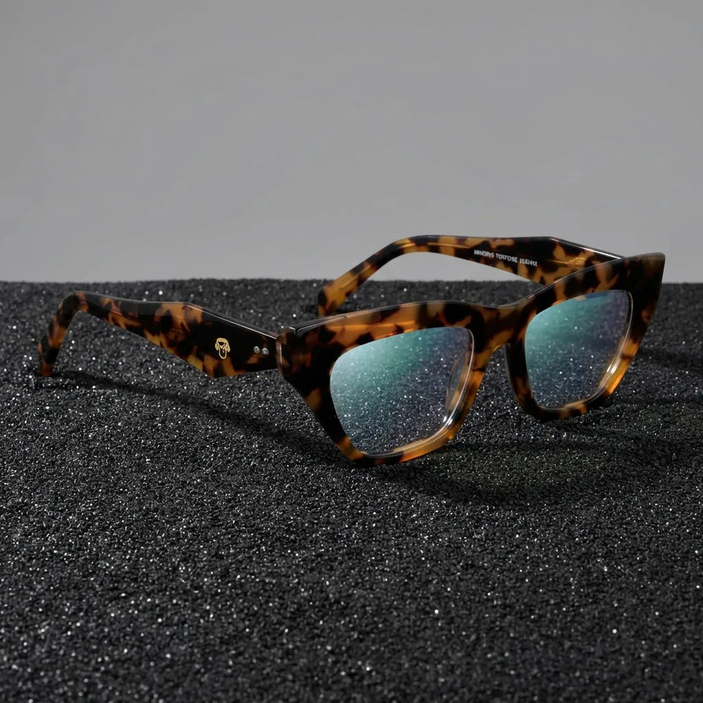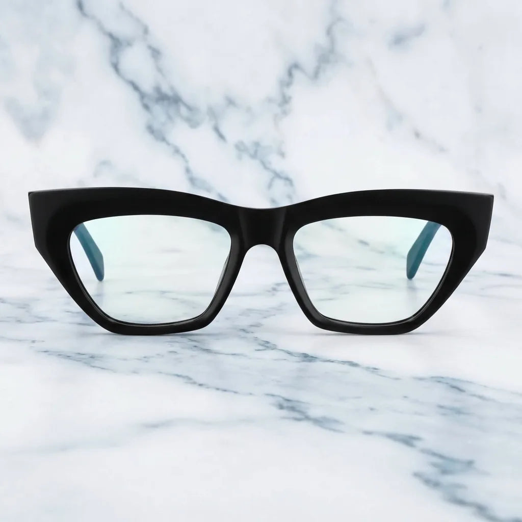 Fabricada en acetato biodegradable de alta gama, este modelo ofrece versiones con lentes neutros de descanso, equipados con filtro azul y tratamiento antirreflejo, ideales para proteger tus ojos frente a las pantallas, o con receta óptica personalizada para una experiencia visual única.