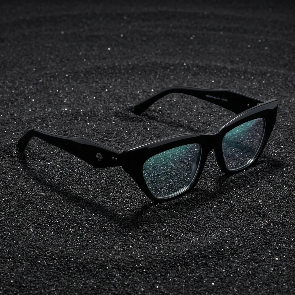 Lenses optical minerva black sobre arena volcánica texturizada diseño sustainable bonoboss