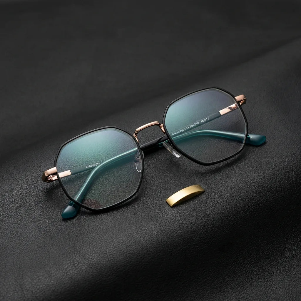 Achteckige, calypsofarbene Optikfassung mit Metallsteg und Silikon-Nasenpads, seitlicher Schrägeinblick. Brillen, die Männern und Frauen mit runden und großen ovalen Gesichtern gut stehen. Bonoboss-Distributor und Großhändler für nachhaltige Linsenoptik
