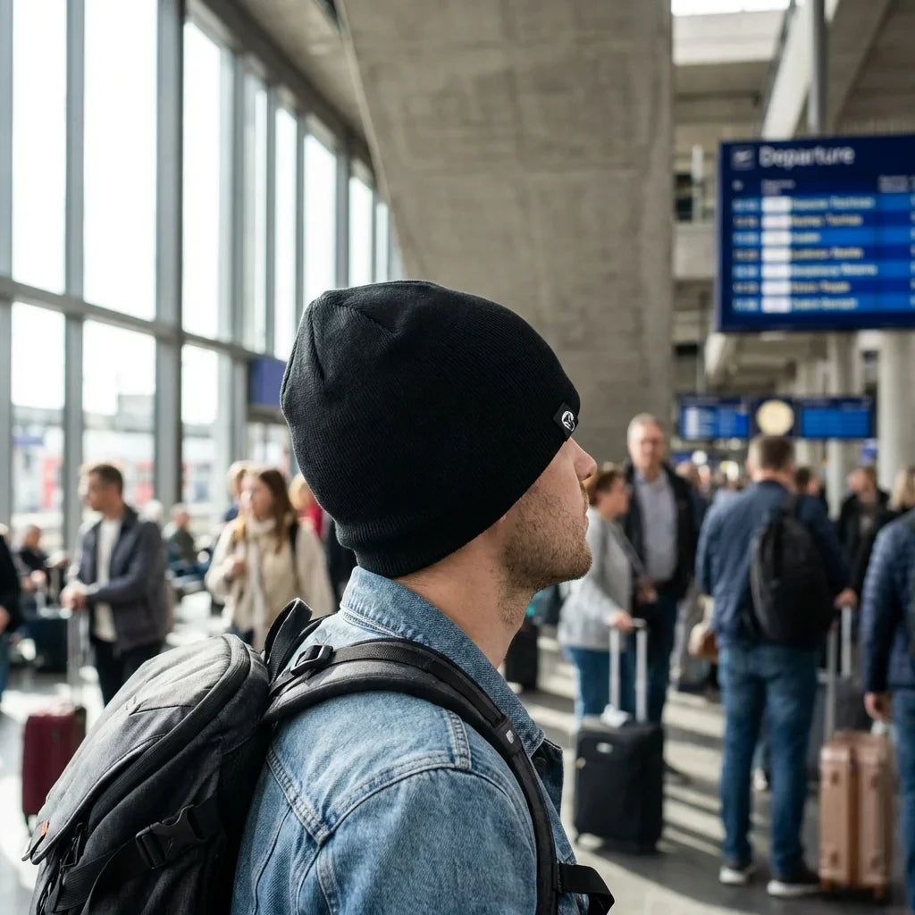 Beanie gorro invierno viajero estación aeropuerto bonoboss