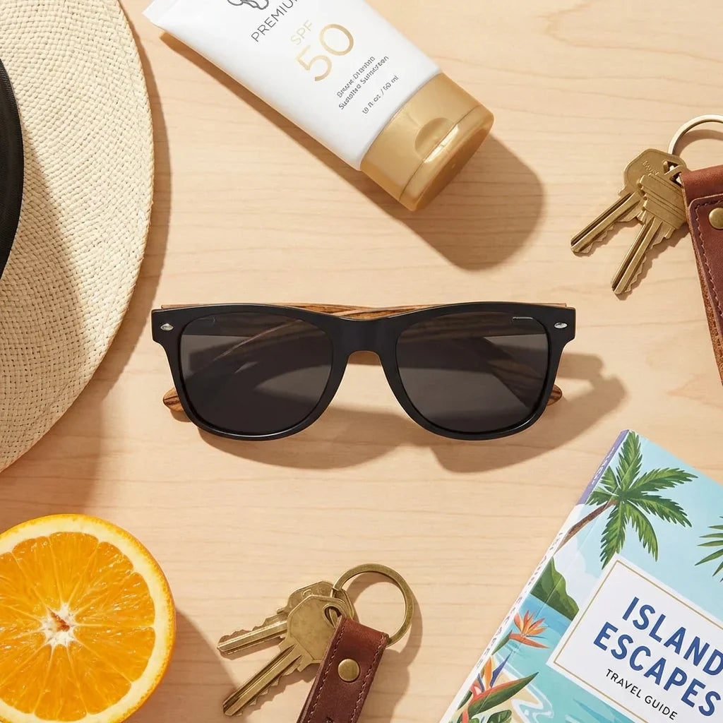 Lenses sun acacia polarized UV400 wood zebrawood black smoke summer essentials flat lay beach accessories bonoboss