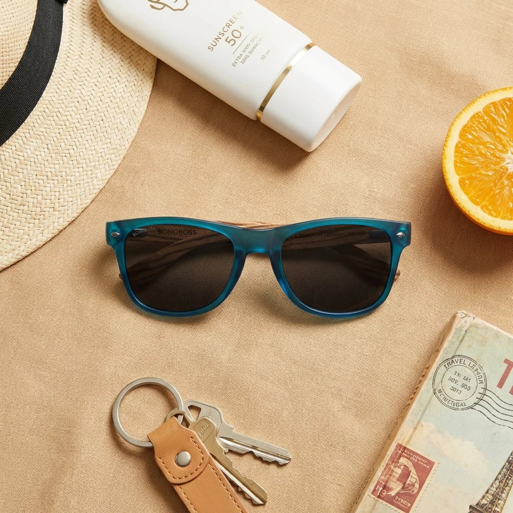 Lenses sun acacia polarized UV400 wood zebrawood clear mirrored blue summer essentials flat lay beach accessories bonoboss
